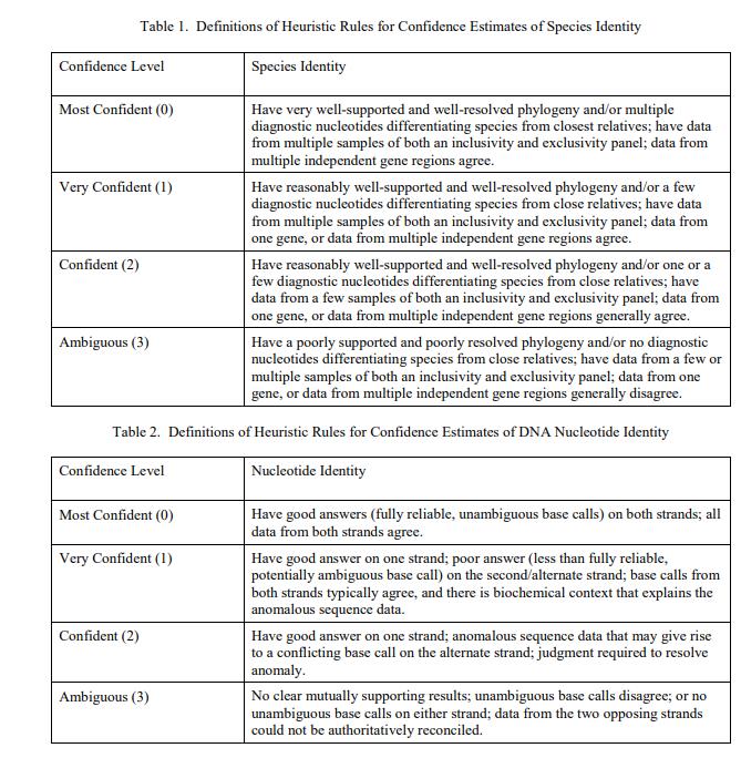 分類學(xué)特征是 Camellia sinensis,由經(jīng)過培訓(xùn)的植物學(xué)家使用來自原始材料的植物標(biāo)本和來自植物學(xué)認(rèn)證的 Camellia sinensis 的相關(guān) DNA 序列分析確定。相關(guān)的 DNA 序列可在伴隨的 FASTA 格式文件中找到 [1]。與序列中每個核苷酸相關(guān)的不確定性,以及與作為物種標(biāo)識符的 DNA 序列相關(guān)的不確定性,以表示規(guī)定值的置信度估計的序數(shù)標(biāo)度表示(表 1 和表 2)[2] .這些 DNA 序列被用作 Camellia sinensis 的身份數(shù)據(jù)來源。