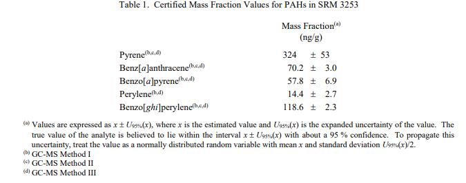 表 1 提供了以干質(zhì)量為基礎(chǔ)報告的選定 PAH 的認(rèn)證質(zhì)量分?jǐn)?shù)值。NIST 認(rèn)證值是 NIST 對其準(zhǔn)確度具有最高置信度的值,在所有已知或懷疑的偏差的來源已被調(diào)查或考慮 [1]。 NIST 進(jìn)行了賦值分析;認(rèn)證值計算為 NIST 方法平均值的未加權(quán)平均值。相關(guān)的不確定性以大約 95% 的置信水平表示 [2-4]。