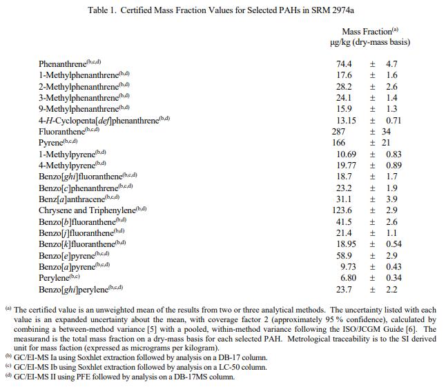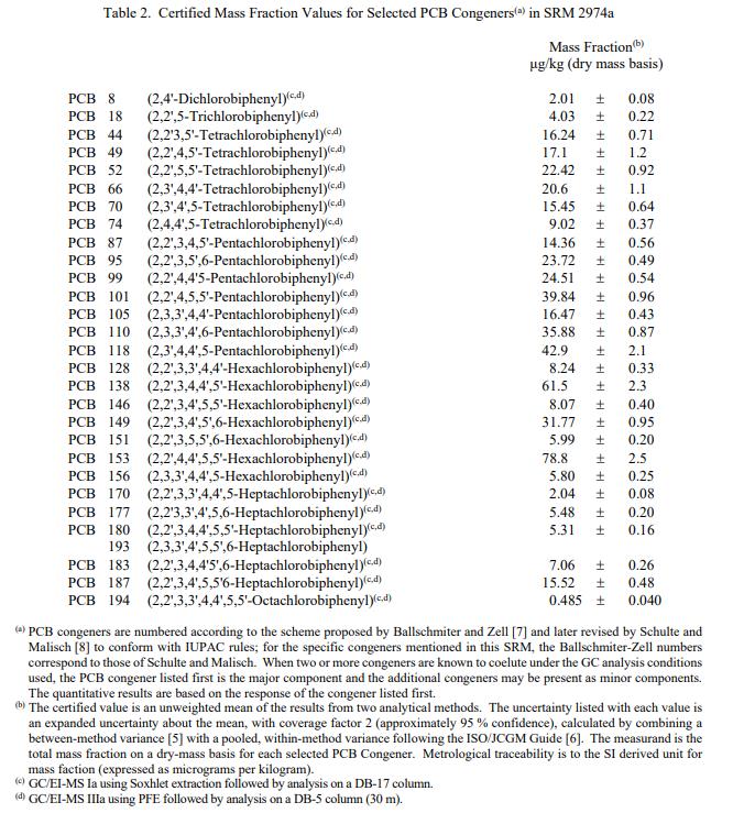 表 1 至表 1 提供了以質(zhì)量分數(shù)表示的 22 種 PAH(一些組合)、29 種 PCB 同族物(一些組合)、八種氯化農(nóng)藥和六種 PBDE 同族物(一些組合)的認證值4、分別。甲基汞、無機汞和總汞的認證值在表 5 中提供。NIST 認證值是 NIST 對其準確性有最高置信度的值,因為所有已知或可疑的偏差來源都已調(diào)查或考慮在內(nèi)[1]。認證值基于 NIST 使用多種分析技術(shù)獲得的結(jié)果的一致性。