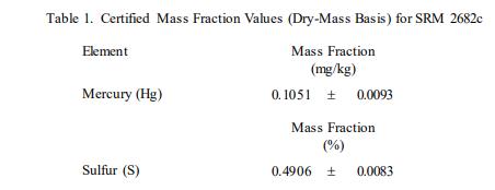 表 1 中提供了汞和硫的認證值,以基于干質(zhì)量的質(zhì)量分數(shù) [1] 表示。NIST 認證值是 NIST 對其準確性有最高置信度的值所有已知或可疑的偏差來源都已被調(diào)查或考慮 [2]。認證值是對真實值的當前最佳估計。