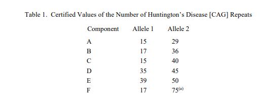 表 1 列出了每個(gè)成分的 [CAG] 重復(fù)次數(shù)的認(rèn)證值。這些認(rèn)證值是通過 Sanger 測序技術(shù)計(jì)算組成等位基因中 [CAG] 重復(fù)單元的數(shù)量來確定的,并通過片段分析(基因分型)確認(rèn)。獨(dú)立的正向和反向測序和片段分析結(jié)果之間的完全一致提供了對規(guī)定整數(shù)計(jì)數(shù)的最高置信度。探索了其他技術(shù),沒有理由懷疑這些結(jié)果。 NIST 認(rèn)證值是 NIST 對其準(zhǔn)確性有最高置信度的值,因?yàn)樗幸阎蚩梢傻钠顏碓炊家颜{(diào)查。這CAG 重復(fù)次數(shù)的認(rèn)證值可追溯到 SI 計(jì)數(shù)單位 (1)。