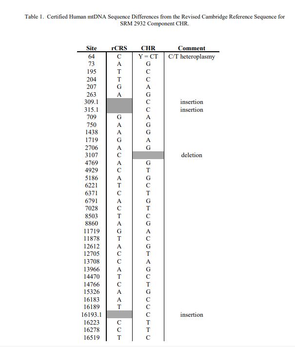 NIST 認證值是 NIST 對其準(zhǔn)確性有最高置信度的值,因為 NIST 已調(diào)查或說明了所有已知或可疑的偏差來源。此 SRM 經(jīng)認證可用于來自兩個類淋巴母細胞培養(yǎng)系(CHR 和 GM09947A)的整個人類 mtDNA(16 569 個堿基對)的序列以及包含 C-stretch 的 CHR 的克隆 HV1 區(qū)域。表 1 包含與 CHR 組件 [1] 的修訂劍橋參考序列 (rCRS) 的序列差異。表 2 包含組件 GM09947A 與 rCRS 的序列差異。表 3 包含成分 CHR 的克隆 HV1 區(qū)域與 rCRS 的序列差異。