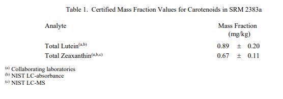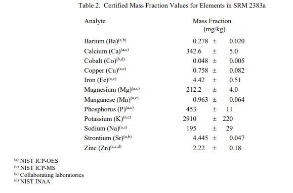 表 1 和表 2 中提供了 SRM 2383a 中類胡蘿卜素和元素的認證質(zhì)量分數(shù)值,按原樣報告。NIST 認證值是 NIST 對其準(zhǔn)確性有最高置信度的值因為所有已知或可疑的偏見來源都已被調(diào)查或考慮到[1]。價值分配分析由 NIST 和合作實驗室進行。