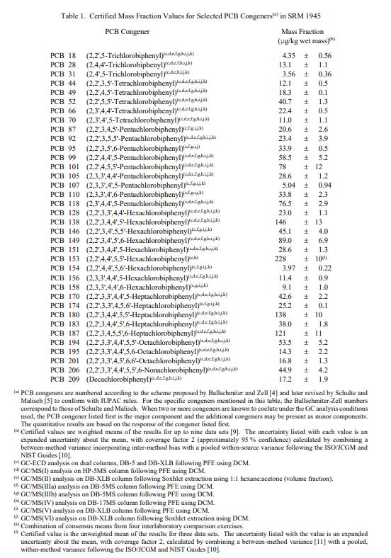 NIST SRM 1945鯨中的有機物(標準品)是一種冷凍鯨脂勻漿,旨在用于評估用于確定選定多氯聯(lián)苯 (PCB) 同系物、氯化農(nóng)藥、多溴二苯醚 (PBDE) 同系物和毒.殺芬同系物的分析方法 [1]。 SRM 1945 已經(jīng)過重新分析,當前的分析證書具有規(guī)定的其他 PCB 同系物和農(nóng)藥的值,以及規(guī)定的 PBDE 和毒.殺芬同系物的值。一個 SRM 1945 單元由兩個帶螺旋蓋的玻璃瓶組成,每個玻璃瓶含有大約 15 克冷凍鯨脂勻漿。