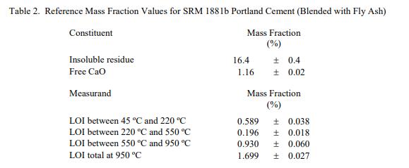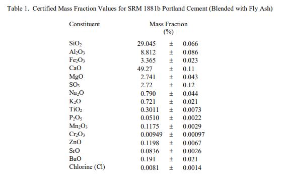 成分和燒失量 (LOI) 的參考值在表 2 中報(bào)告為質(zhì)量分?jǐn)?shù)。 NIST 參考值是未經(jīng)認(rèn)證的值,它是基于可用數(shù)據(jù)對(duì)真實(shí)值的當(dāng)前最佳估計(jì);但是,該值不符合 NIST 認(rèn)證標(biāo)準(zhǔn)并提供相關(guān)的不確定性可能僅反映測(cè)量再現(xiàn)性,可能不包括所有不確定性來源,或者可能反映多種分析方法之間缺乏足夠的統(tǒng)計(jì)一致性 [2]。