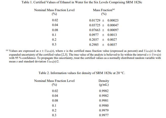 NIST SRM 1828c 乙醇-水溶液(標準品)是一組六級乙醇(乙醇:化學(xué)文摘社 [CAS] 注冊號 64-17-5)。 SRM 1828c 旨在用于校準用于測定水溶液中乙醇的儀器和技術(shù)。一個 SRM 1828c 單元由六個 2 mL安瓿,0.02%、0.04%、0.08%、0.1%、0.2% 和 0.3% 的標稱乙醇質(zhì)量分數(shù)各一個安瓿。每個安瓿含有大約 1.2 mL 的溶液。