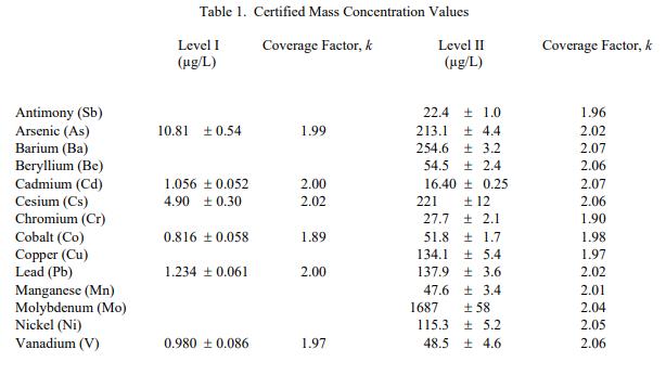 表 1 列出了 SRM 2668 人尿液中的有毒元素標準品 的 I 級 6 種元素和 II 級 14 種元素的認證質(zhì)量濃度值。 NIST 認證值是 NIST 對其準確性有最高信心的值已知或可疑的偏見來源已被調(diào)查或考慮帳戶 [1]。數(shù)值來自 NIST 和合作實驗室提供的結(jié)果的組合。